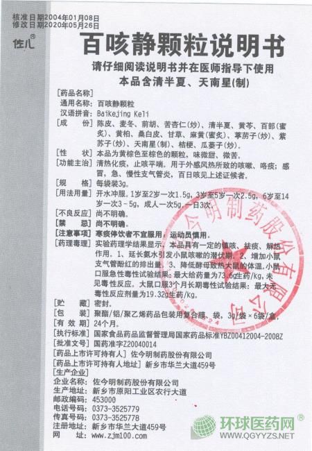 - 本頁面信息僅供參考,請以產(chǎn)品實際附帶說明書為準。 佐兒 百咳靜顆粒 說明書文字版 [藥品名稱]通用名稱:百咳靜顆粒 漢語拼音:Bai