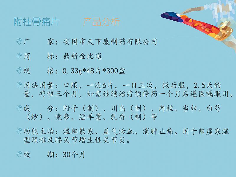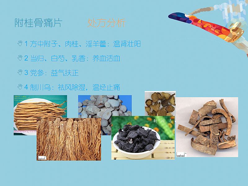 | 作用機(jī)理 | 溫陽散寒,益氣活血,消腫止痛。 1附子、肉桂、淫羊藿:溫腎壯陽 2當(dāng)歸、白芍、乳香:養(yǎng)血活血 3黨參:益氣扶正 4制川烏:祛風(fēng)除濕,溫經(jīng)止痛 |