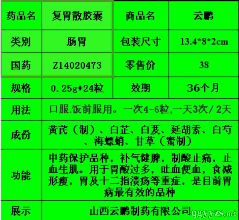 | 補(bǔ)充說明 | 【藥品生產(chǎn)單位】:山西臨汾云鵬藥業(yè)有限公司 1.中藥保護(hù)品種,國家三類新藥。 2.全國規(guī)格,嚴(yán)密市場保護(hù)。 3.治療胃病新的藥品,胃康寧的升級(jí)品種。 4.組方嚴(yán)格,藥材地道。 |