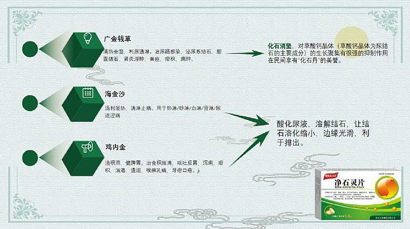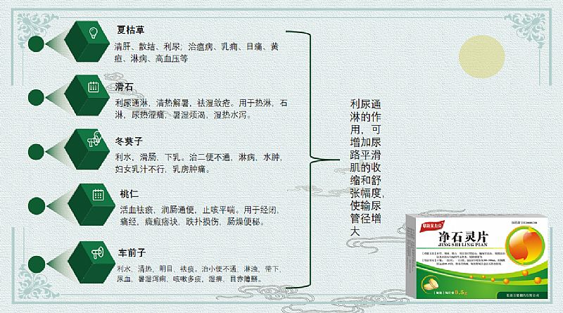 | 作用機(jī)理 | 桃仁、赤芍活血化瘀排石裂石; 金錢草、海金砂、萹蓄、雞內(nèi)金清熱利濕,通淋排石; 甘草緩急止痛,以助排石 凈石靈片通過科學(xué)的配伍共同發(fā)揮相輔相成,通過活血化瘀通淋排石的方法達(dá)到很好的治療作用。 |