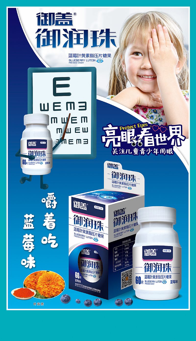 | 作用機(jī)理 | 御蓋御潤(rùn)珠藍(lán)莓葉黃素酯 一天一片嚼一嚼 主要成分有藍(lán)莓、葉黃素等 |