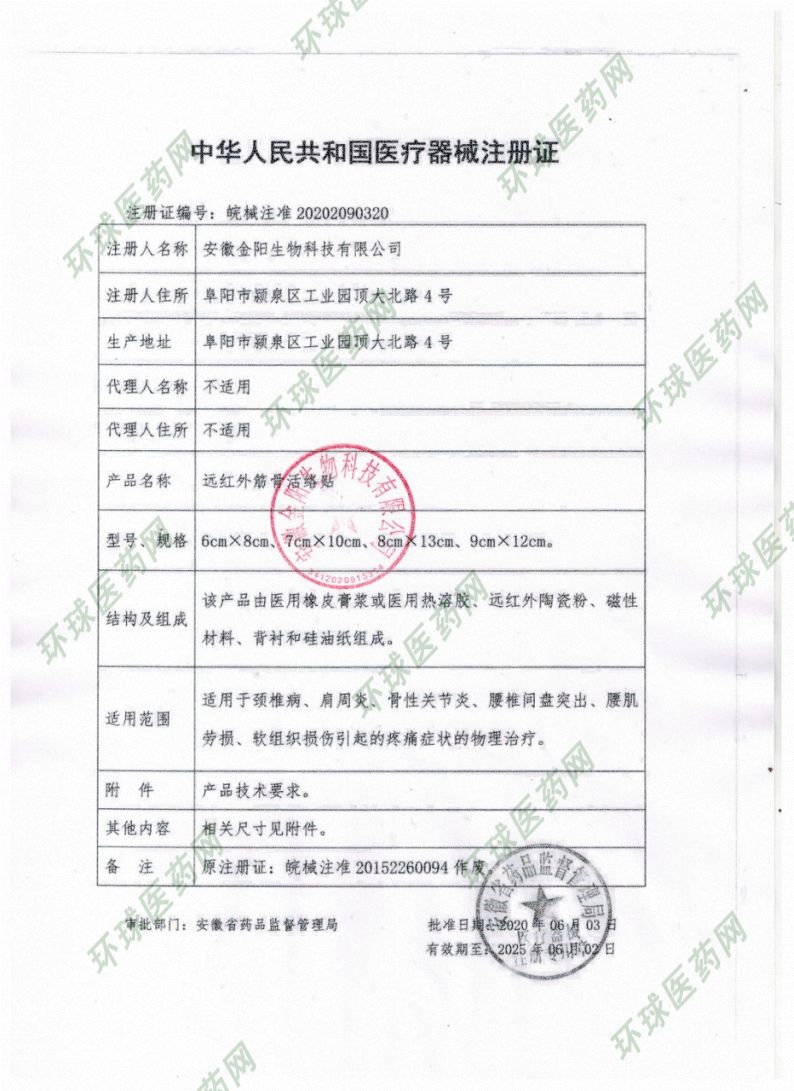 | 產(chǎn)品用途 | 主要用于頸椎病、肩周炎、骨性關(guān)節(jié)炎、腰椎間盤突出、腰肌勞損、軟組織損傷引起疼痛癥狀的物理治療。 遠(yuǎn)紅外筋骨活絡(luò)貼由醫(yī)用橡皮膏膠漿或醫(yī)用熱熔膠、磁性材料、遠(yuǎn)紅外陶瓷粉、背襯及硅油紙組成。遠(yuǎn)紅外陶瓷粉能夠輻射遠(yuǎn)紅外線被人體皮膚吸收產(chǎn)生熱能,從而達(dá)到改善微循環(huán)、增強(qiáng)肌體細(xì)胞活力及代謝等作用,再配以磁場物理療法,直接貼敷于患部,能有效促進(jìn)患部血液循環(huán),提高代謝機(jī)能,以達(dá)到祛寒、活血止痛、舒筋通絡(luò)之功效。 【禁忌癥】 •金屬異物局部,心臟起搏器局部; •嚴(yán)重心,肝,肺,腎衰竭者; •孕婦下腹部; •出血及有出血傾向者。 •嚴(yán)重過敏體質(zhì)者。 【注意事項(xiàng)、警示及提示性說明書】 •本品為一次性所使用。 •如皮膚出現(xiàn)紅腫,水泡等過敏現(xiàn)象應(yīng)立即停用本品。 |