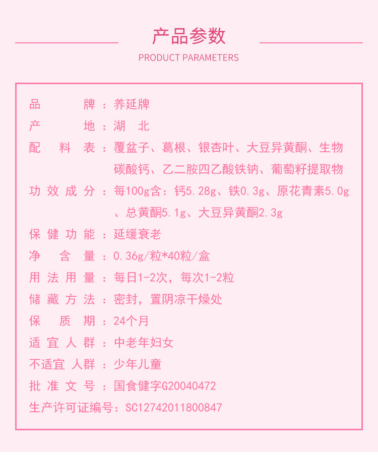 | 主要成分 | 覆盆子、葛根、銀杏葉、大豆異黃酮、生物碳酸鈣、乙二胺四乙酸鐵鈉、葡萄籽提取物 |