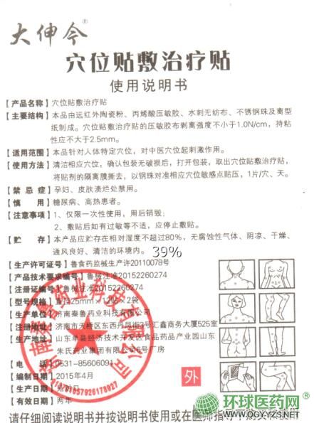 | 使用方法 | 清潔相應穴位,確認包裝物破損后,打開包裝,取出穴位貼服治療貼,將貼劑的隔離膜撕去,以鋼珠對準相應穴位敏感點貼壓,1片/穴、天。 |