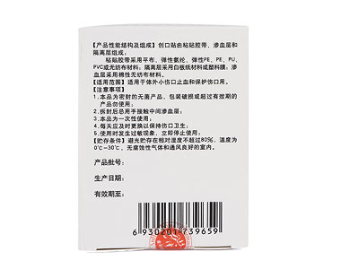 | 補充說明 | 優(yōu)勢:創(chuàng)可貼能夠壓迫止血、保護創(chuàng)面、預(yù)防感染、促進愈合,同時,又具有體積小、使用簡單、攜帶方便等優(yōu)點。 注意事項 本品為密封的無菌產(chǎn)品,包裝破損或超過有效期的產(chǎn)品勿使用。 拆封后忌用手接觸中間滲血期。 |
