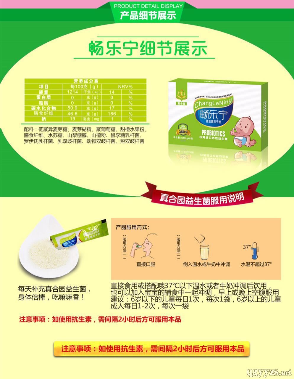 | 主要成分 | 低聚異麥芽糖、麥芽糊精、聚葡萄糖、甜橙膳食纖維、鼠李糖乳桿菌、羅伊氏乳桿菌、乳雙歧桿菌、動物雙歧桿菌、短雙歧桿菌等 |