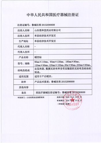 | 使用方法 | 暖宮貼確認(rèn)包裝無破損后,打開包裝,取出暖宮貼,將貼劑的隔離膜撕去,貼于患者下腹正中臍下三指對(duì)應(yīng)的“氣海穴”的內(nèi)褲外側(cè),每24小時(shí)更換一次,流產(chǎn)連續(xù)使用5~10天;順產(chǎn)連續(xù)使用10~15天;剖宮產(chǎn)連續(xù)使用15~20天。 |