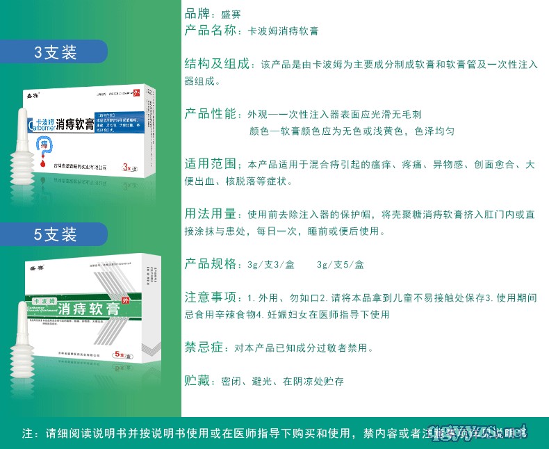 | 使用方法 | 使用前去除注入器保護(hù)帽,將卡波姆消痔軟膏擠入肛門內(nèi)或直接涂抹患處,每日一次,睡前或便后使用。 |
