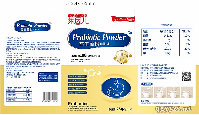 | 主要成分 | 食用葡萄糖,水蘇糖乳粉,蘋果粉,酵母,低聚果糖,乳雙歧桿菌凍干粉,嗜酸乳桿菌凍干粉,干酪乳桿菌凍干粉,鼠李糖乳桿菌凍干粉,植物乳桿菌凍干粉,檸檬酸,葡萄糖酸鈣,葡萄糖酸鋅,乳酸亞鐵 |