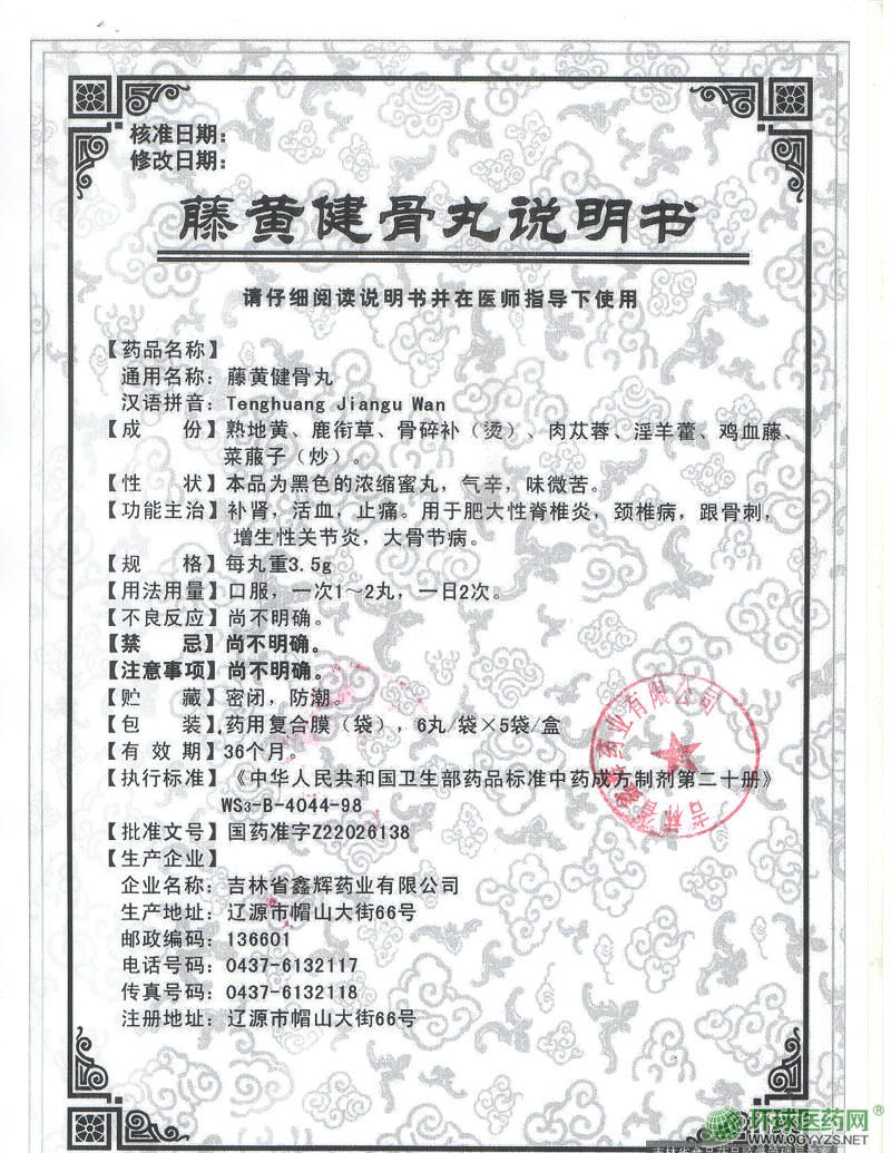 | 功能主治 | 補(bǔ)腎,活血,止痛。用于肥大性脊椎炎,頸椎病,跟骨刺,增生性關(guān)節(jié)炎,大骨節(jié)病。藤黃健骨丸超微粒藥物分子,隨著血液循環(huán)通過骨脈直接進(jìn)入骨骼髓腔,促進(jìn)骨髓健康細(xì)胞快速再生,使骨骼充盈有力,激活骨髓修復(fù)功能。促進(jìn)骨髓合成大量骨營養(yǎng)與骨保護(hù)蛋白,使原來萎縮破裂的骨膜、脊椎關(guān)節(jié)纖維恢復(fù)正常,利用骨髓的記憶與修復(fù)功能,使骨關(guān)節(jié)增生、骨刺,自我吸收修復(fù),從而使關(guān)節(jié)變形得以修復(fù)。 |