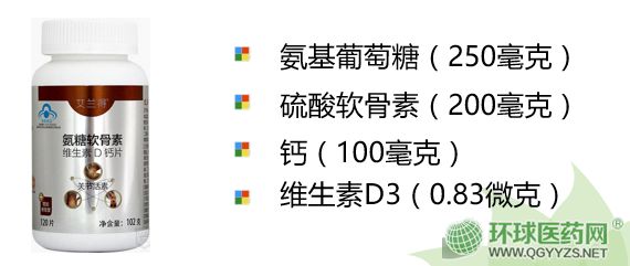| 主要成分 | 每100g含:氨基葡萄糖鹽酸鹽 29.41g、硫酸軟骨素 23.53g、鈣 11.76g、維生素D3 97.65μg |