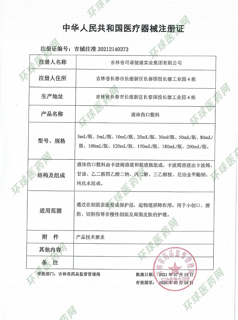 | 補(bǔ)充說(shuō)明 | 【產(chǎn)品性能】顏色應(yīng)為無(wú)色或淺黃色,色澤均勻,無(wú)異物;pH值應(yīng)為4.5-7.0;羧酸基含量:每100mL樣品中含羧酸基(-COOH)應(yīng)為0.02g-0.10g;無(wú)菌提供;其他內(nèi)容詳見(jiàn)產(chǎn)品技術(shù)要求。 【結(jié)構(gòu)及組成】液體傷口敷料由卡波姆溶液和載液瓶組成,卡波姆溶液由卡波姆、甘油、乙二胺四乙酸二鈉、丙二醇、三乙醇胺、尼泊金甲酯鈉、純化水組成。 【使用方法】1.取本品適量,直接用于患處,每日1-3次;2.取本品適量,在專業(yè)醫(yī)師指導(dǎo)下,師傅使用;3.小創(chuàng)口、擦傷、切割傷等非慢性創(chuàng)面護(hù)理取本品適量直接沖洗即可。 |
