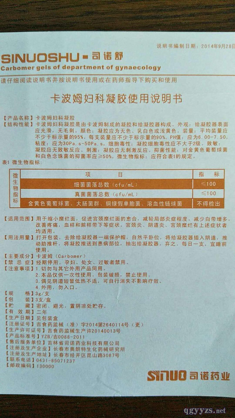 | 補(bǔ)充說明 | 【產(chǎn)品名稱】卡波姆婦科凝膠 【結(jié)構(gòu)性能】卡波姆婦科凝膠是由卡波姆制成的凝膠和給凝膠器構(gòu)成。外觀:給凝膠器表面應(yīng)光滑,無毛刺。顏色:凝膠應(yīng)為無色、乳白色或淺黃色。裝量:平均裝量應(yīng)不少于標(biāo)示量的95%,每支裝量應(yīng)不少于標(biāo)示量的90%。PH值:應(yīng)為6.00-7.50。粘度:應(yīng)為30Pa.s-50Pa.s。細(xì)胞毒性:凝膠細(xì)胞毒性應(yīng)不大于2級(jí)。致敏:凝膠應(yīng)無致敏反應(yīng)。刺激:凝膠應(yīng)***反應(yīng)。抑菌性能:對(duì)金黃色葡萄球菌和白色念珠菌的抑菌率應(yīng)≥50%。微生物指標(biāo):應(yīng)符合表1的規(guī)定。 表1 微生物指標(biāo) 項(xiàng)目 指標(biāo) 細(xì)菌菌落總數(shù)(cfu/ml) ≤100 真菌菌落總數(shù)(cfu/ml) ≤100 金黃色葡萄球菌、大腸桿菌、銅綠假單胞菌、溶血性鏈球菌 不得檢出 【適用范圍】用于縮小糜爛面,促進(jìn)宮頸糜爛面的愈合,減輕局部炎癥程度,減少白帶增多,改善疼痛,血樣和膿樣帶下等癥狀。宮頸炎、陰道炎、宮頸糜爛有上述癥狀者均適用。 【用法用量】打開包裝,去除給凝膠器一端保護(hù)帽,自然平臥位,將給凝膠器插入陰道,推動(dòng)助推桿,將凝膠推送到患病部位,抽出給凝膠器,棄之。每日一支,宜睡前使用。 【主要成分】卡波姆(Carbomer) 【禁 忌 癥】經(jīng)期停用。孕婦、處女、過敏者禁用。 【注意事項(xiàng)】 1.切勿與其它外用產(chǎn)品同用。 2.本品僅供一次性使用。包裝破損,禁止使用。 3.偶見陰道短暫低熱不適,可自行消失不影響療效。 4.外用,勿入口。 【規(guī) 格】3g/支 【包 裝】3支/盒 【貯 藏】密閉、避光,置陰涼處貯存。 【有效期】二年 |