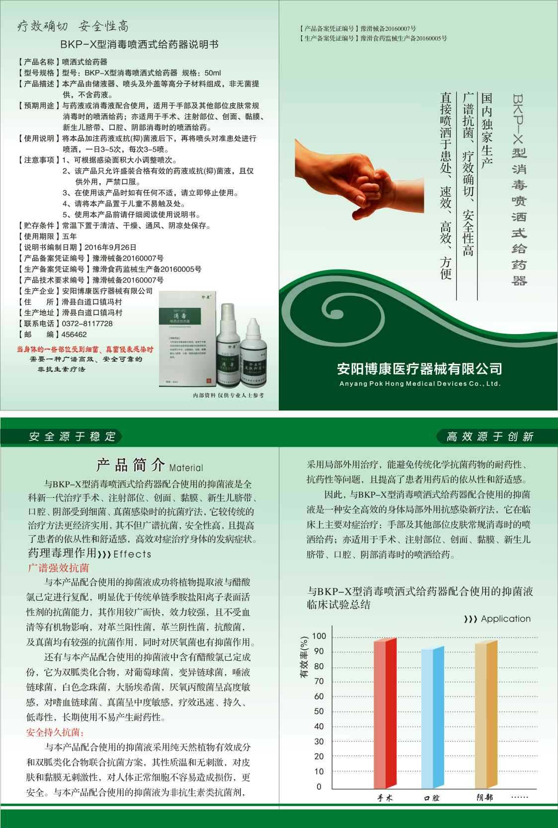 | 補(bǔ)充說(shuō)明 | 與藥液或消毒液配合使用,適用于手部及其他部位皮膚常規(guī)消毒時(shí)的噴灑給藥;亦適用于手術(shù)、注射部位、創(chuàng)面、黏膜、新生兒臍帶、口腔、陰部消毒時(shí)的噴灑給藥。 |