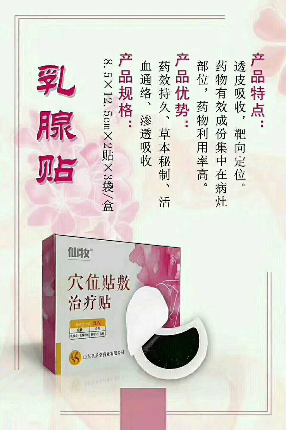 | 產(chǎn)品賣點 | 采用國際先進的滲透透皮技術(shù),多種原材料濃縮萃取精華而形成,直接貼于乳房不適部位,靶向定住,透皮給藥,不傷脾胃,療效持久。 |