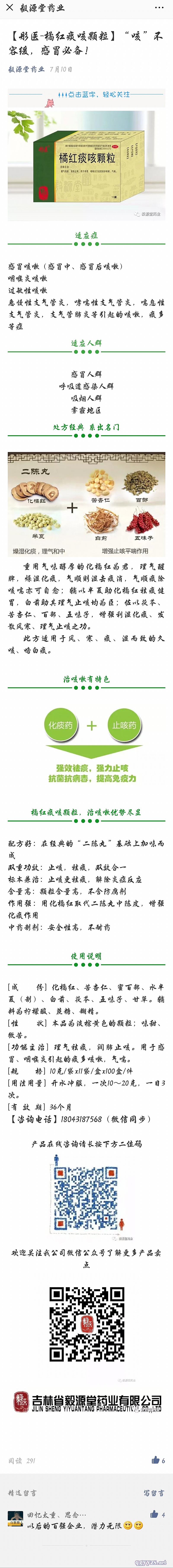功能主治 理氣祛痰,潤肺止咳。用于感冒、咽喉炎引起的痰多咳嗽,氣喘。