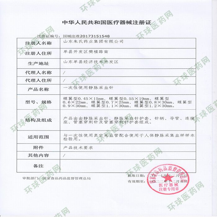 | 補充說明 | 生產(chǎn)企業(yè)許可證號:魯食藥監(jiān)械生產(chǎn)許20140053號 結(jié)構(gòu)組成:本產(chǎn)品由靜脈采血針、靜脈采血針保護套、針柄、導管、連接座、管塞穿刺針及管塞穿刺針護套組成。 產(chǎn)品性能:針尖鋒利,無毛刺;針管、針柄、軟管、連接座及管塞穿刺針各部位連接牢固氣密性良好且無堵塞;經(jīng)環(huán)氧乙烷滅菌,無菌。 一次性使用靜脈采血針生產(chǎn)廠家,資質(zhì)齊全,面向全國各地底價招商供貨;診所、醫(yī)院、社區(qū)醫(yī)院、醫(yī)療器械公司均可操作! |