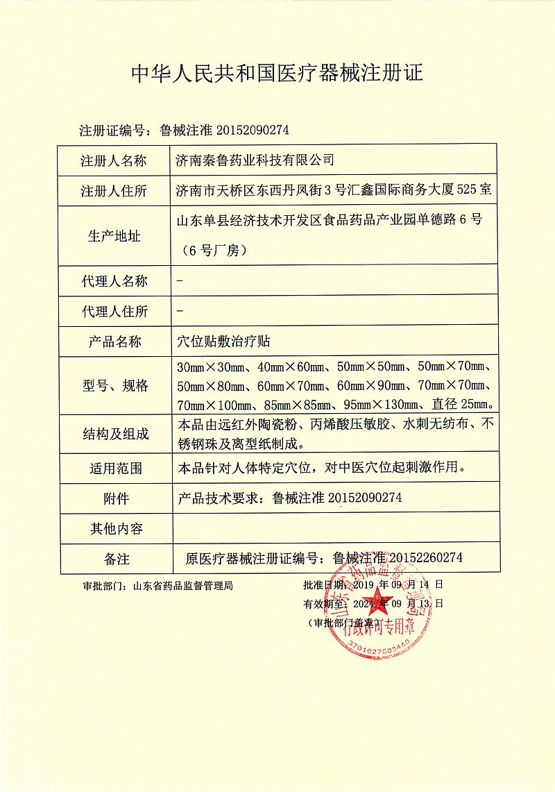 | 產(chǎn)品用途 | 終端OEM其他中標朱氏堂鳴葉婦科穴位貼敷治療貼乳腺增生貼牌定制代理代【產(chǎn)品名稱】穴位貼敷治療貼 【結(jié)構(gòu)及組成】本品由遠紅外陶瓷粉、丙烯酸壓敏膠、水刺無紡布、不銹鋼珠及離型 紙制成。穴位貼敷治療貼的壓敏膠布剝離強度不小于1.0N/cm,持粘性應(yīng) 不大于2.5mm,遠紅外發(fā)射波長范圍8μm—15μm,法向比輻射率≥75%。 【適用范圍】本品針對人體特定穴位,對中醫(yī)穴位起刺激作用。 【使用方法】1、清潔相應(yīng)穴位,先以拇指依次揉按相應(yīng)穴位,每次1~2分鐘,范圍由小 到大。力量由輕到重,探尋敏感點。 2、確認包裝無破損后,打開包裝,取出穴位貼敷治療貼,將貼劑的隔離 膜撕去,以鋼珠對準相應(yīng)穴位敏感點貼壓,1片/穴、天,每日適度按 壓3~5次,每次3~5分鐘,1個療程為10天,療程間隔2~3天。 【產(chǎn)品禁忌癥】糖尿病、高熱患者慎用;孕婦、皮膚潰爛處禁用。 |