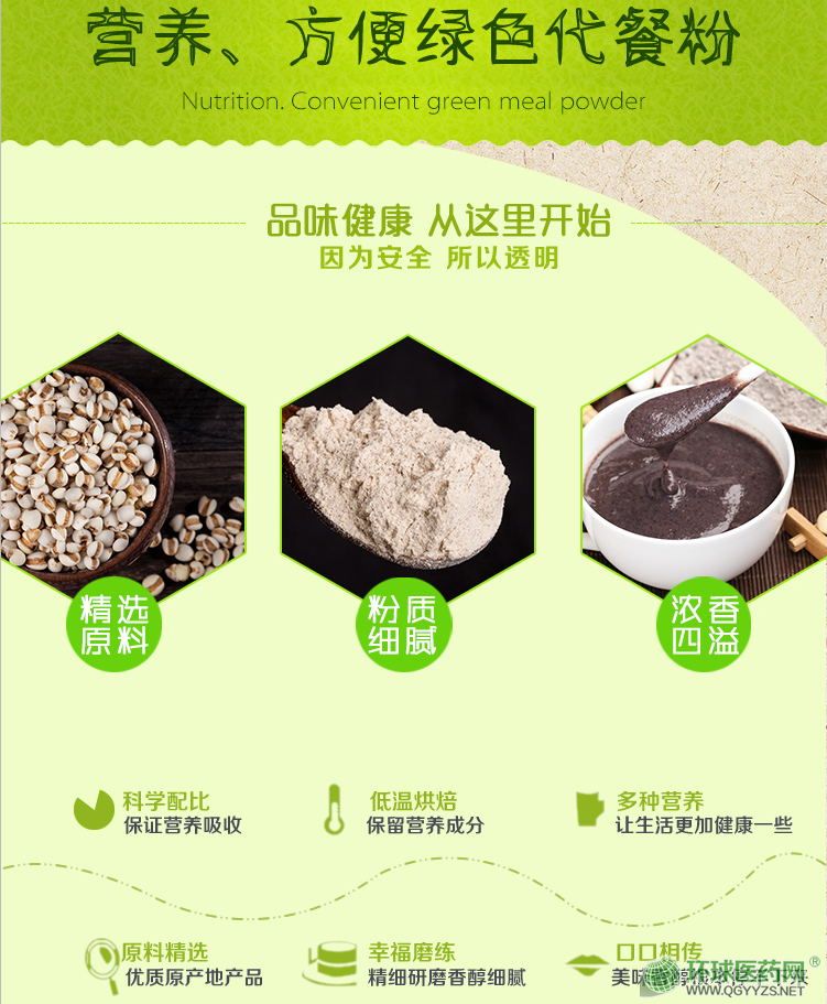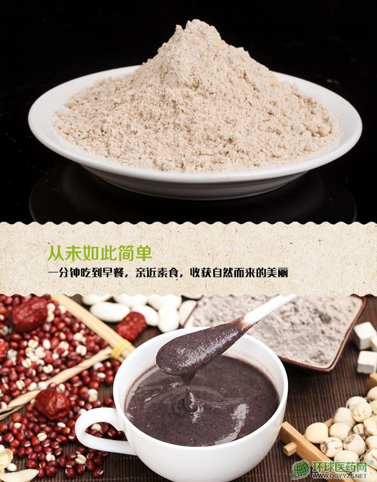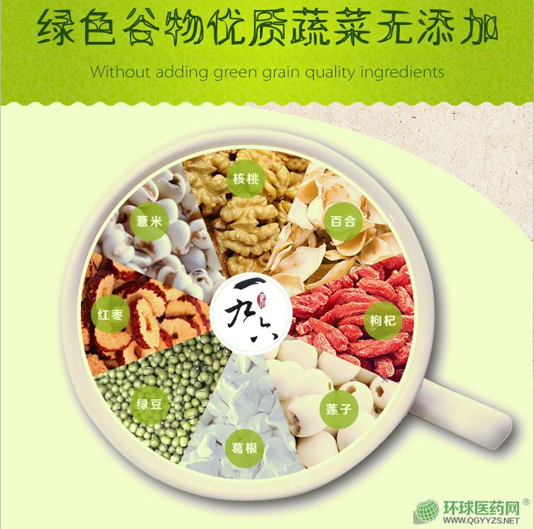 | 主要成分 | 薏米、燕麥、南瓜、小黃米、紫薯、花生仁、黑芝麻、山藥、葵花子、紅棗、黑木耳、西蘭花、決明子、黃豆、枸杞、山楂、綠豆、大麥、大米、郁李仁、紅豆、百合、檸檬、胡蘿卜、方瓜籽,西蘭花籽、菠菜籽、抹茶、糙米、糯米、高粱米、豇豆、蠶豆、豌豆、 黑小豆、白扁豆、刀豆、蕓豆、草莓、石榴籽、魚腥草、莧菜籽、蔥籽、茴香籽、亞麻籽、代代花、白扁豆花、紫云英花、丁香、金銀花、白蘿卜、青椒、魔芋、小茴香、木瓜、黑米、黍米 |