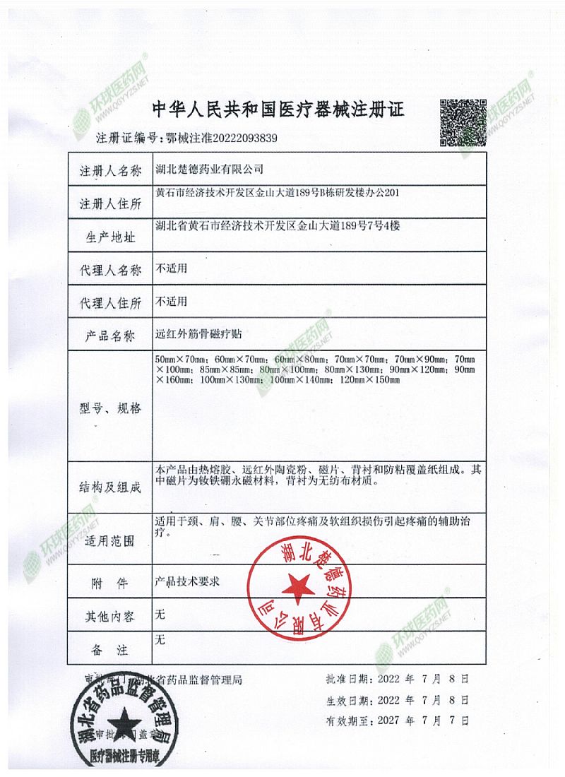 | 補(bǔ)充說明 | 【產(chǎn)品名稱】遠(yuǎn)紅外筋骨磁療貼 【型號(hào)規(guī)格】50mm×70mm;60mm×70mm;60mm×80mm;70mm×70mm;70mm×90mm;70mm×100mm;85mm×85mm;80mm×100mm;80mm×130mm;90mm×120mm;90mm×160mm;100mm×130mm;100mm×140mm;120mm×150mm。 【產(chǎn)品性能】本品磁感應(yīng)強(qiáng)度應(yīng)為20mT~150mT;遠(yuǎn)紅外法向發(fā)射率應(yīng)≥85%。 【使用方法】外用,將所貼部位皮膚清洗干凈,揭去防粘紙,貼于患處。 【禁忌癥】 1、有開放性傷口者禁用; 2、植入心臟起搏器及金屬異物局部禁用;嚴(yán)重心,肝,肺,腎衰竭患者禁用; 3、孕婦下腹部禁用; 4、出血及有出血傾向者禁用; 5、對(duì)磁療有明顯不良反應(yīng)者禁用; 6、體質(zhì)極度虛弱者禁用。 【注意事項(xiàng)】 1、本品為一次性使用,勿重復(fù)使用; 2、本產(chǎn)品為外用,禁止口服; 3、皮膚過敏者,如出現(xiàn)瘙癢、皮疹等,應(yīng)立即停止使用。 【貯藏及運(yùn)輸】密封、置室內(nèi)干燥處。包裝好的產(chǎn)品在運(yùn)輸過程中應(yīng)防曬,防潮,并**產(chǎn)品包裝在運(yùn)輸途中不受損壞。 【有效期】兩年 【生產(chǎn)許可證編號(hào)】鄂藥監(jiān)械生產(chǎn)許20221170號(hào) 【醫(yī)療器械注冊(cè)證編號(hào)】鄂械注準(zhǔn)20222093839 【醫(yī)療器械產(chǎn)品技術(shù)要求編號(hào)】鄂械注準(zhǔn)20222093839 【注冊(cè)人/生產(chǎn)企業(yè)/售后服務(wù)單位】湖北楚德藥業(yè)有限公司 【注冊(cè)人住所】黃石市經(jīng)濟(jì)技術(shù)開發(fā)區(qū)金山大道189號(hào)B棟研發(fā)樓辦公201 【生產(chǎn)地址】湖北省黃石市經(jīng)濟(jì)技術(shù)開發(fā)區(qū)金山大道189號(hào)7號(hào)4樓 【聯(lián)系電話】 0714-8660120 【說明書編制/修訂日期】2022年7月8日 |