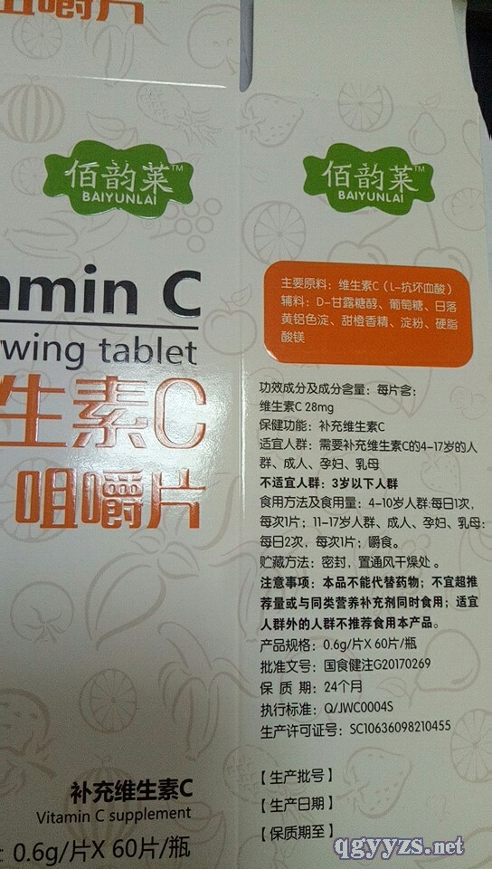 | 主要成分 | 維生素C9L-抗壞血酸)D-甘露糖醇、葡萄糖、日落黃鋁色淀、甜橙香精、淀粉、硬脂酸鎂 |