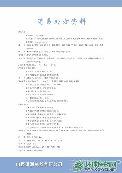 | 英文名稱 | Calcium Lactate,Calcium Gluconate and Calcium Hydrogen Phosphate Chewable Tablets |