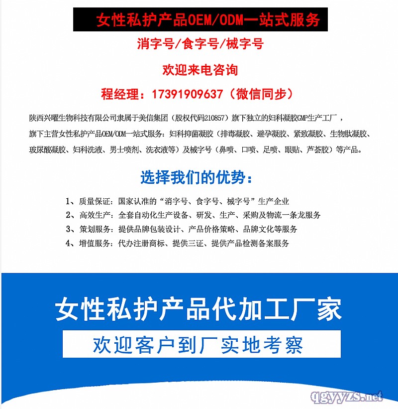 | 其它說明 | (消字號產(chǎn)品、成品、裸支、噴劑、貼劑等等)婦科凝膠生產(chǎn)廠家直銷 價(jià)格合理 有意者電話洽談! |