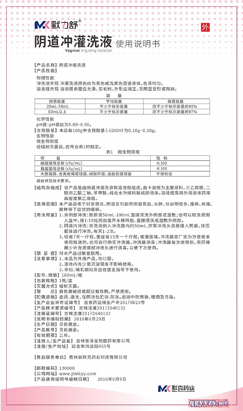 | 補(bǔ)充說明 | 【產(chǎn)品名稱】陰道沖灌洗液 【產(chǎn)品性能】 物理性能 沖洗器外觀沖灌洗液顏色應(yīng)為無色或淺黃色澄清液體。色澤均勻。 溶液瓶外觀溶液瓶表面應(yīng)光滑,無毛刺,外形應(yīng)端正,無明顯變形或殘缺。 裝量 標(biāo)示裝量每瓶裝量 20mL-50mL不少于標(biāo)示裝量應(yīng)不少于標(biāo)示裝量的95% 50mL以上不少于標(biāo)示裝量應(yīng)不少于標(biāo)示裝量的97% 化學(xué)性能 pH值:pH應(yīng)為5.00~6.50。 【含羧酸基】本品每100g中含羧酸基(-COOH)為0.10g-0.30g。 生物性能 微生物限度 經(jīng)輻射滅菌后,應(yīng)符合表1的規(guī)定。 表1微生物限度 項(xiàng)目指標(biāo) 細(xì)菌茵落總數(shù)(cfu/ml)≤100 真菌萄落總數(shù)(cfu/mL)≤100 大腸菌群、金黃色葡萄球菌、綠膿桿菌、溶血性鏈球菌不得檢出 其他詳見技術(shù)要求。 【結(jié)構(gòu)及組成】該產(chǎn)品是由陰道沖灌洗液和溶液瓶組成。由卡波姆為主要原料,三乙醇胺、二胺四乙酸二鈉、苯甲醇、純化水為輔料制成的液體。溶液瓶采用外用液體藥用高密度聚乙烯瓶。 【適用范圍】本產(chǎn)品適用于對宮頸炎、陰道炎引起的陰道充血、水腫、分泌物增多、瘙癢、疼痛、膿樣帶下癥狀的緩解。 【用法用量】1、外陰部沖洗:取原液50ml-100mL直接清洗外陰部或濕敷;也可以取洗液倒 入盆中,按1:10比例加溫開水稀釋后,真接清洗或濕敷外陰部。 2、陰道內(nèi)沖洗:將洗液倒入沖洗器內(nèi)約50mL,擰緊沖洗頭直接插入陰道,擠壓瓶體進(jìn)行沖洗,每天1-2次。 3、輕者7天一療程,重癥者15天一個(gè)療程,或遵醫(yī)囑。沖洗器是廠家為方便患者使用贈(zèng)送的,也可自行購買沖洗器。沖洗器消毒:沖洗器每次使用后,用藥棉蘸少許洗液擦拭沖洗頭進(jìn)行消毒,以便下次使用。 【禁忌癥】對本產(chǎn)品過敏者禁用。 【注意事項(xiàng)】1、本品為外用產(chǎn)品,勿口服。 2、液體內(nèi)有少量沉淀現(xiàn)象不影響使用。 3、孕婦、哺乳期婦女應(yīng)在醫(yī)生指導(dǎo)下使用。 【型號、規(guī)格】160mL/瓶 【包裝規(guī)格】1瓶/盒 【滅菌方式】輻射滅菌。 【警示】若包裝破損或超過有效期,嚴(yán)禁使用。 【貯藏運(yùn)輸】密閉、避光、在陰涼處貯存,防凍。運(yùn)輸中防雨淋、曝曬及污染。 【生產(chǎn)企業(yè)許可證編號】吉食藥監(jiān)械生產(chǎn)許20170023號 【產(chǎn)品技術(shù)要求編號】吉械注準(zhǔn)20172640132 【注冊證編號】吉械注準(zhǔn)20172640132 【說明書編制日期】2016年6月29日 【生產(chǎn)日期】見包裝盒。 【產(chǎn)品批號】見包裝盒。 【有效期限】三年。 【注冊人/生產(chǎn)企業(yè)】吉林普澤生物醫(yī)藥有限公司 【注冊/生產(chǎn)地址】延吉市鴻運(yùn)街955號 |