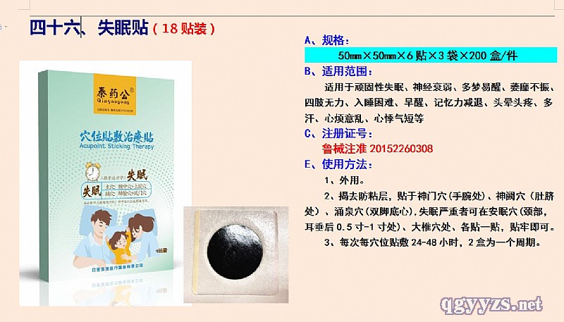 | 產(chǎn)品賣點 | 秦藥公失眠貼針對頑固性失眠、神經(jīng)衰弱、多夢易醒、萎靡不振、四肢無力、入睡困難、早醒、記憶力減退、頭暈頭疼、多汗、心煩意亂、心悸氣短等,通過穴位滲透刺激,起到輔助治療的作用。 |