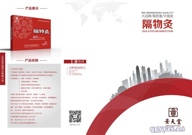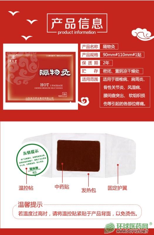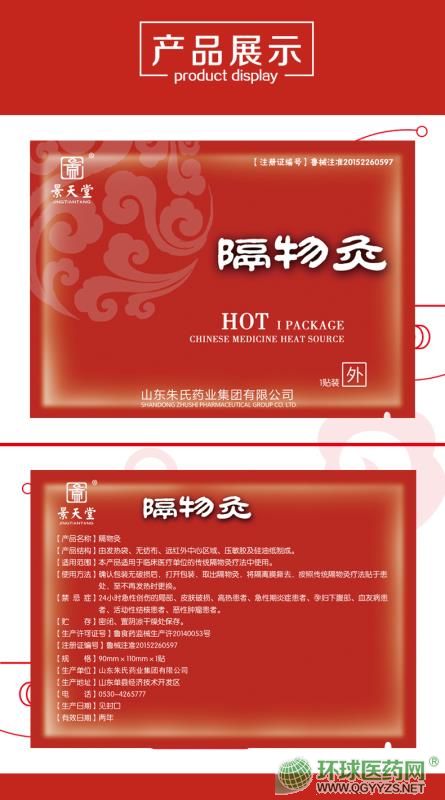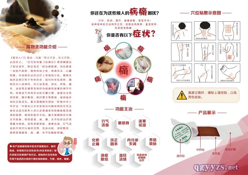 | 使用方法 | 確認(rèn)包裝無(wú)破損后,打開(kāi)包裝,取出隔物灸,將隔離膜撕去,按照傳統(tǒng)隔物灸療法貼于患處,至不在發(fā)熱時(shí)更換 |