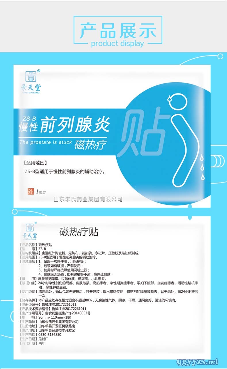 | 補(bǔ)充說(shuō)明 | 【產(chǎn)品名稱(chēng)】慢性前列腺炎磁熱療貼 【型 號(hào)】ZS-B 【結(jié)構(gòu)及組成】由遠(yuǎn)紅外陶瓷粉、無(wú)紡布、發(fā)熱袋、永磁片、壓敏膠及硅油紙制成。 【適用范圍】ZS-B型適用于慢性前列腺炎的輔助治療。 【注意事項(xiàng)】1、**一次性使用,用后銷(xiāo)毀; 2、包裝如有破損,嚴(yán)禁使用; 3、使用時(shí)嚴(yán)格按照使用說(shuō)明進(jìn)行; 4、敷貼后無(wú)熱感,如有過(guò)敏等不適,應(yīng)停止敷貼; 【慎 用】皮膚感覺(jué)障礙、過(guò)敏體質(zhì)、糖尿病、小兒患者。 【禁 忌 癥】24小時(shí)急性創(chuàng)傷的局部、皮膚破損、高熱患者、急性期炎癥患者、孕婦下腹部、血友病患者、活動(dòng)性結(jié)核患者、惡性腫瘤患者。 【使用說(shuō)明】清潔患處,確認(rèn)包裝無(wú)破損后,打開(kāi)包裝,取出磁熱療貼,將貼劑的隔離膜撕去,貼于患處,每24小時(shí)更換一次。 【儲(chǔ)存條件】本產(chǎn)品應(yīng)貯存在相對(duì)濕度不超過(guò)80%,無(wú)腐蝕性氣體、陰涼、干燥、通風(fēng)良好、清潔的環(huán)境內(nèi)。 【注冊(cè)證編號(hào)】魯械注準(zhǔn)20172261011 【產(chǎn)品技術(shù)要求編號(hào)】魯械注準(zhǔn)20172261011 【生產(chǎn)許可證號(hào)】魯食藥監(jiān)械生產(chǎn)許20140053號(hào) 【規(guī) 格】9cm×11cm×1貼×3袋 【生產(chǎn)單位】山東朱氏藥業(yè)集團(tuán)有限公司 【注冊(cè)地址】山東單縣開(kāi)發(fā)區(qū)樊樓路南 【生產(chǎn)地址】山東單縣經(jīng)濟(jì)技術(shù)開(kāi)發(fā)區(qū) |