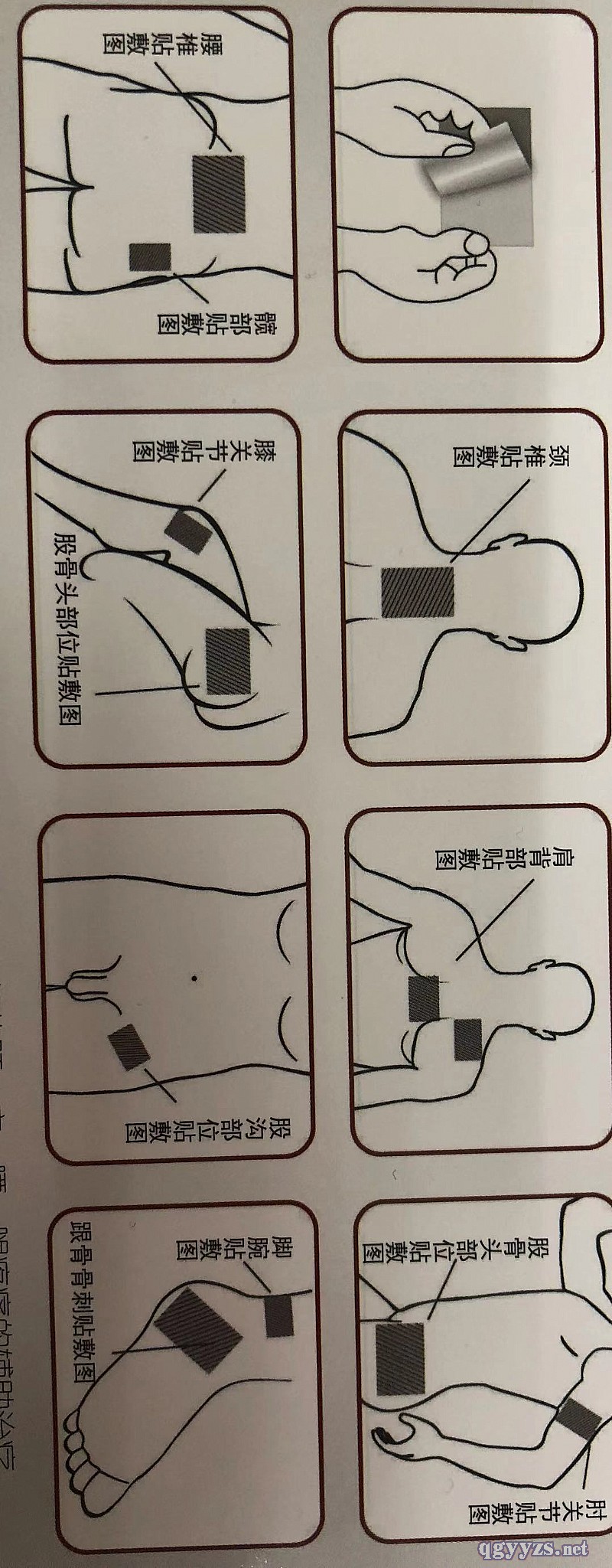 | 使用方法 | 清潔患部皮膚,將消痛貼揭開(kāi),按圖示方法貼敷于患處,輕壓周邊膠布貼實(shí),不漏氣,每次貼敷5-7天,病情嚴(yán)重者可在患處一次貼敷2-4貼,其他無(wú)名腫脹,可直接貼敷患處。兩次貼敷間隔6小時(shí)。 |