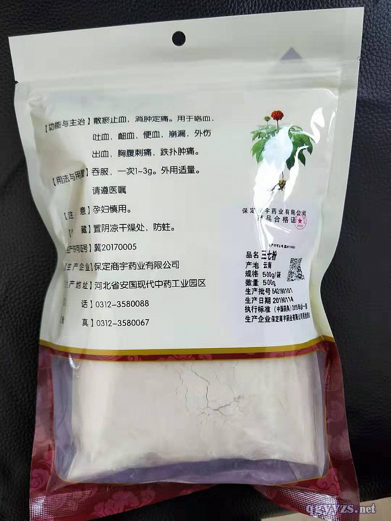 | 補(bǔ)充說(shuō)明 | 1、三七:取原藥材,除去雜質(zhì),用時(shí)搗碎。 2、三七粉:取三七,洗凈,干燥,碾細(xì)粉。 3、熟三七:取凈三七打碎,分開(kāi)大小塊,用食用油炸至表面棕黃色,取出,瀝出油,研細(xì)粉。 4、三七片:取三七,洗凈,蒸透,取出,及時(shí)切片,干燥 |