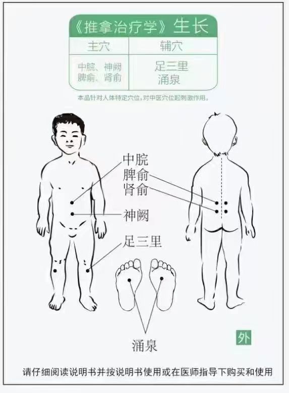 | 使用方法 | 1.清潔相應(yīng)穴位,先以拇指依次揉按相應(yīng)穴位,每穴1~2分鐘。范圍由小到大,力量由輕到重,探尋敏感點。2.確認包裝無破損后。打開包裝,取出穴位貼敷治療貼,將貼劑的隔高膜撕去,以鋼珠對準相應(yīng)穴位敏感點貼壓,1片/穴。天,每日適度按壓3~5次,,每次3~5分鐘,1個療程為10天,療程間隔2~3天。 |