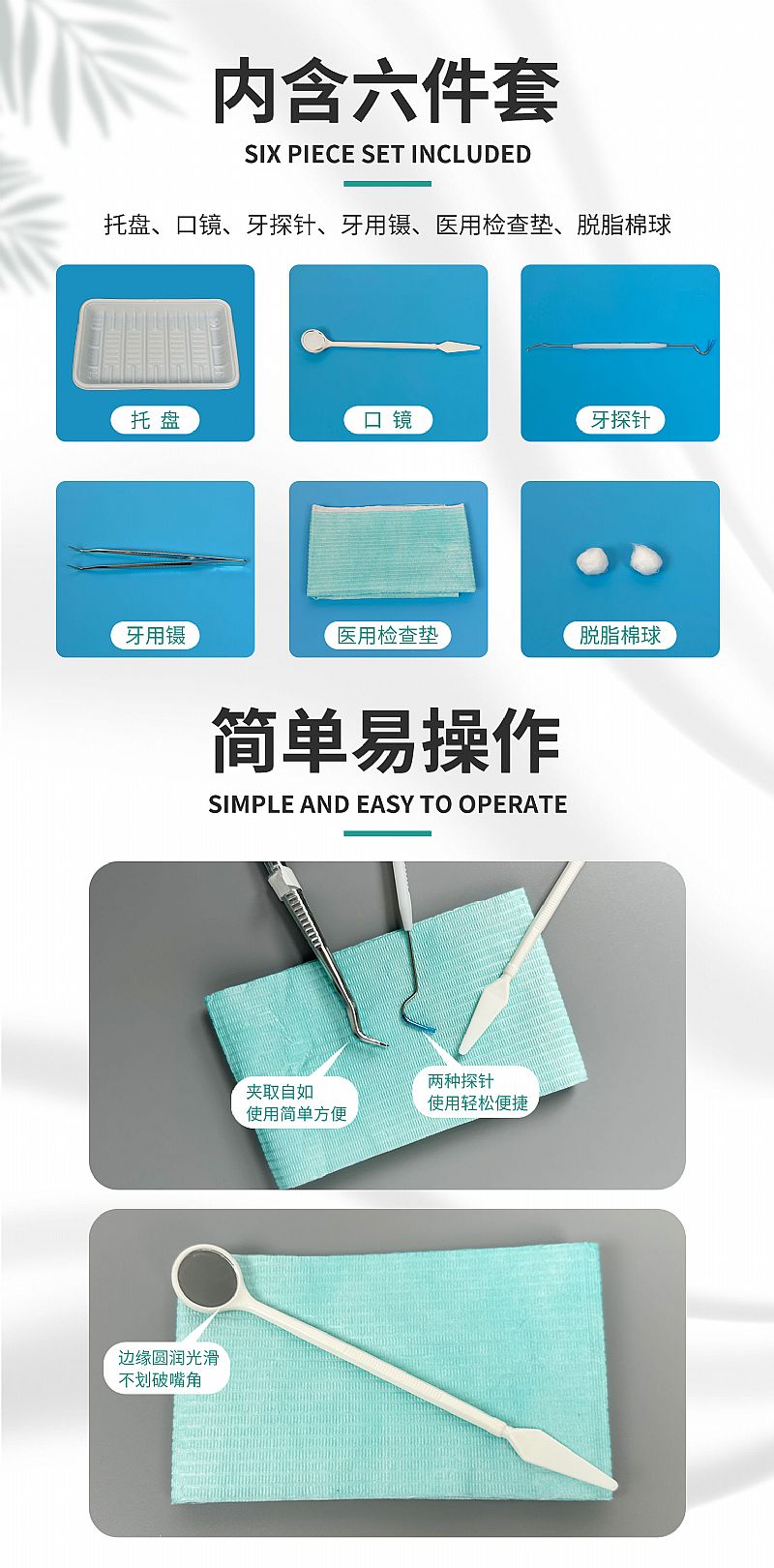 | 補(bǔ)充說(shuō)明 | 【型號(hào)規(guī)格】 ZS-1:托盤(pán)、口鏡、牙探針、牙用鑷; ZS-2:托盤(pán)、口鏡、牙探針、牙用鑷、脫脂棉球; ZS-3:托盤(pán)、口鏡、牙探針、牙用鑷、醫(yī)用檢查墊; ZS-4:托盤(pán)、口鏡、牙探針、牙用鑷、醫(yī)用檢查墊、水槍頭; ZS-5:托盤(pán)、口鏡、牙探針、牙用鑷、醫(yī)用檢查墊、脫脂棉球; ZS-6:托盤(pán)、口鏡、牙探針、牙用鑷、醫(yī)用檢查墊、脫脂棉球、檢查手套; ZS-7:托盤(pán)、口鏡、牙探針、牙用鑷、醫(yī)用檢查墊、脫脂棉球、吸唾管; ZS-8:托盤(pán)、口鏡、牙探針、牙用鑷、醫(yī)用檢查墊、脫脂棉球、檢查手套、吸唾管; |