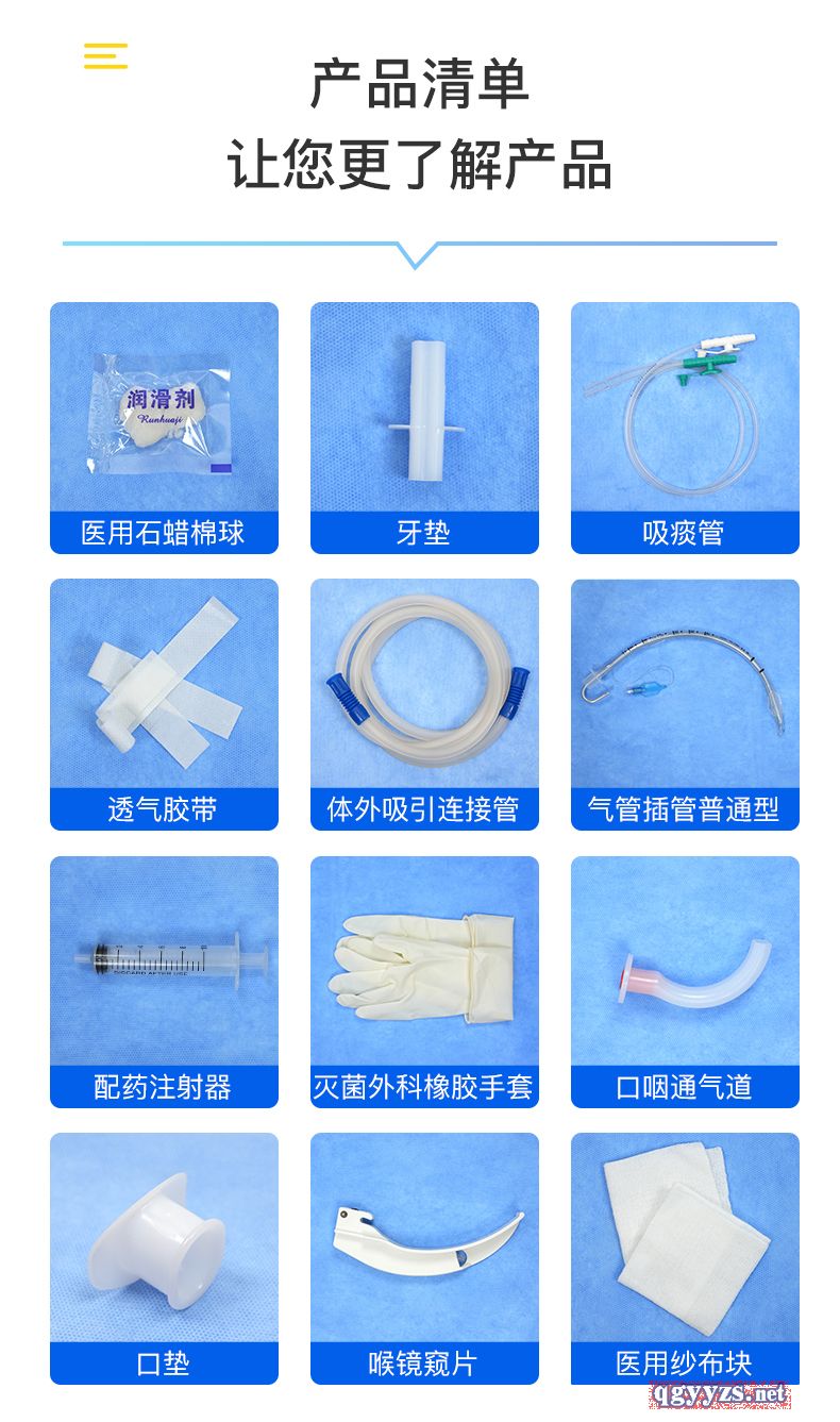| 主要成分 | 一次性使用氣管插管包由基本配置:普通型氣管插管或加強型氣管插管,選用配置:導(dǎo)芯、一次性使用配藥用注射器(僅供套囊充氣使用)、一次性使用喉鏡窺片、一次性使用吸痰管、一次性使用體外吸引連接管、一次性使用口咽通氣道、牙墊、口墊、醫(yī)用紗布塊、包布、一次性使用滅菌橡膠外科手套、醫(yī)用石蠟棉球、透氣膠貼(非織造布膠帶)、托盤組成。 |