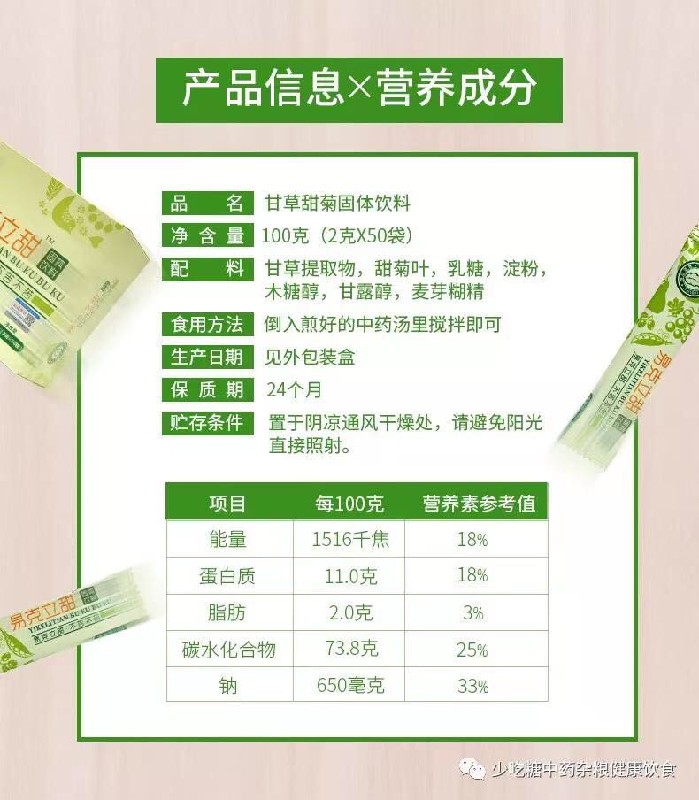 | 補(bǔ)充說明 | 【品名】甘草甜菊固體飲料 【凈含量】100克(2克×50袋) 【配料】甘草提取物,甜菊葉,乳糖,淀粉,木糖醇,甘露醇,麥芽糊精 【食用方法】倒入煎好的中藥湯里攪拌即可。 【保質(zhì)期】24個(gè)月 【貯存條件】置于陰涼通風(fēng)干燥處,請避免陽光直接照射。 【產(chǎn)品標(biāo)準(zhǔn)代號】GB/T29602 【食品生產(chǎn)許可證編號】SC11637131100270 【禁忌人群】高血糖、糖尿病患者禁止食用 |