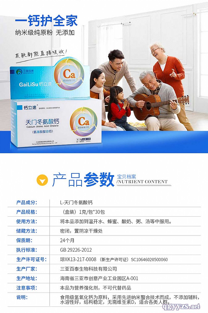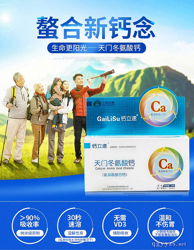 | 補(bǔ)充說明 | 【產(chǎn)品名稱】鈣立速 天門冬氨酸鈣(納米氨基酸螯合鈣)盒裝 【產(chǎn)品成份】天門冬氨酸鈣 【產(chǎn)品規(guī)格】30包/盒 【使用方法】將本品添加溫開水或粥、湯、飲料等中服用。 【用 量】?jī)? 童:每次半包,每日2次, 青少年:每次1包,每日1-2次, 成年人:每次1包,每日1-2次。 【注意事項(xiàng)】本品不能代替藥物。 【生產(chǎn)許可證編號(hào)】SC10646020500060 【招商企業(yè)】三亞百泰生物科技有限公司 鈣立速®天門冬氨酸鈣是運(yùn)用納米螯合雙項(xiàng)專利技術(shù)制備而成,完全溶解于水,無需胃酸分解,無需維生素D3輔助吸收,可以被小腸粘膜細(xì)胞主動(dòng)識(shí)別吸收,吸收率達(dá)90%以上,產(chǎn)品呈中性,對(duì)胃腸***,真正實(shí)現(xiàn)高溶解、高吸收、高**。 特性與用途: 白色粉末,易吸濕。溶解度高,水溶液無色無味,呈中性,穩(wěn)定性好。主要生理功能為補(bǔ)鈣。據(jù)認(rèn)為鰲合型氨基酸鈣中的鈣并不以通常鈣鹽的離子方式被吸收,而是作為整個(gè)分子的一部分(鰲合形式)進(jìn)入腸絨毛細(xì)胞,進(jìn)入細(xì)胞后由于pH值的改變或肽酶的作用而水解、部分水解或不水解,像一般肽那樣隨胞內(nèi)流動(dòng)液在主動(dòng)運(yùn)輸條件下從細(xì)胞進(jìn)入血液,并運(yùn)送至全身。另?yè)?jù)介紹,天冬氨酸鈣曾經(jīng)上海市衛(wèi)生防疫站測(cè)定,其腸道吸收率高達(dá)90%。 |