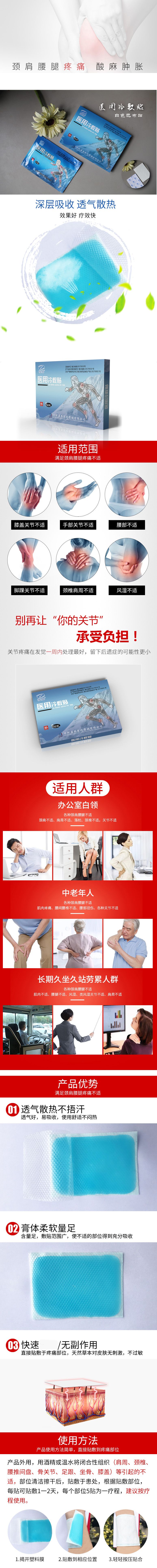 | 使用方法 | 沿易撕口撕開包裝袋,取出貼片,揭去薄膜,將凝膠面貼于患處。每天使用1~3片,每片可持續(xù)使用4小時(shí) |