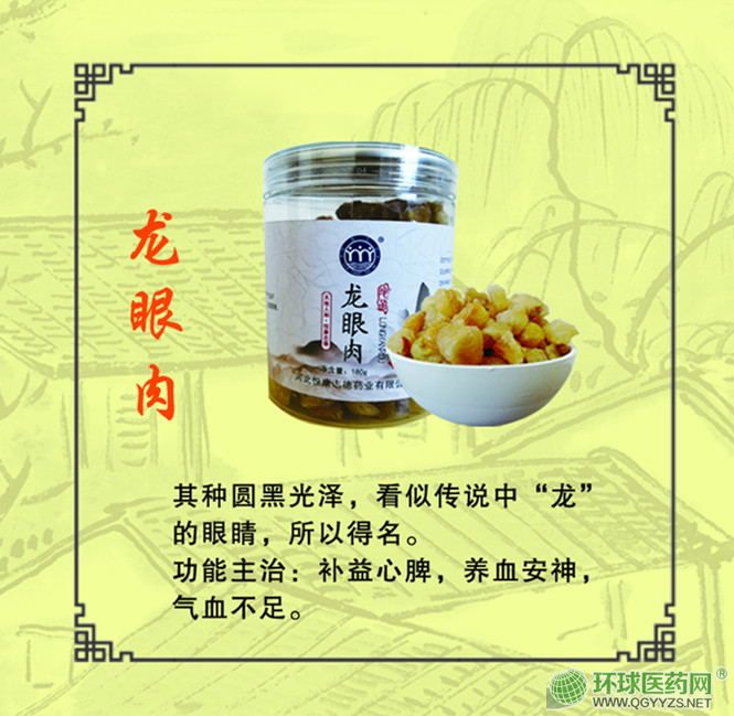 | 產(chǎn)品賣點(diǎn) | 龍眼肉甘潤(rùn)味厚,能補(bǔ)心脾、益氣血、潤(rùn)臟、健腦力、寧神志,并且該品補(bǔ)而不燥,滋而不膩,富含營(yíng)養(yǎng)物質(zhì)及多種維生素,具有促進(jìn)造血,改善心腦血量和降血脂作用,為滋補(bǔ)心脾之佳品。凡老人體弱,病后體虛,或勞傷心脾,氣血不足所致之失眠健忘,心悸怔忡,頭暈眼花,少氣倦怠等,可配伍黨參(老年人配伍太子參)、丹參、黃芪、當(dāng)歸、酸棗仁、遠(yuǎn)志、茯苓等,以補(bǔ)益心脾、養(yǎng)血安神 |
