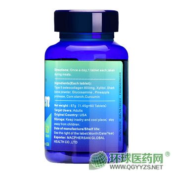 | 主要成分 | 膠原蛋白(Ⅱ)、木糖醇、鯊魚骨粉、蝦蟹濃縮粉、菠蘿蛋白酶、玉米淀粉、裸藻、姜黃 |