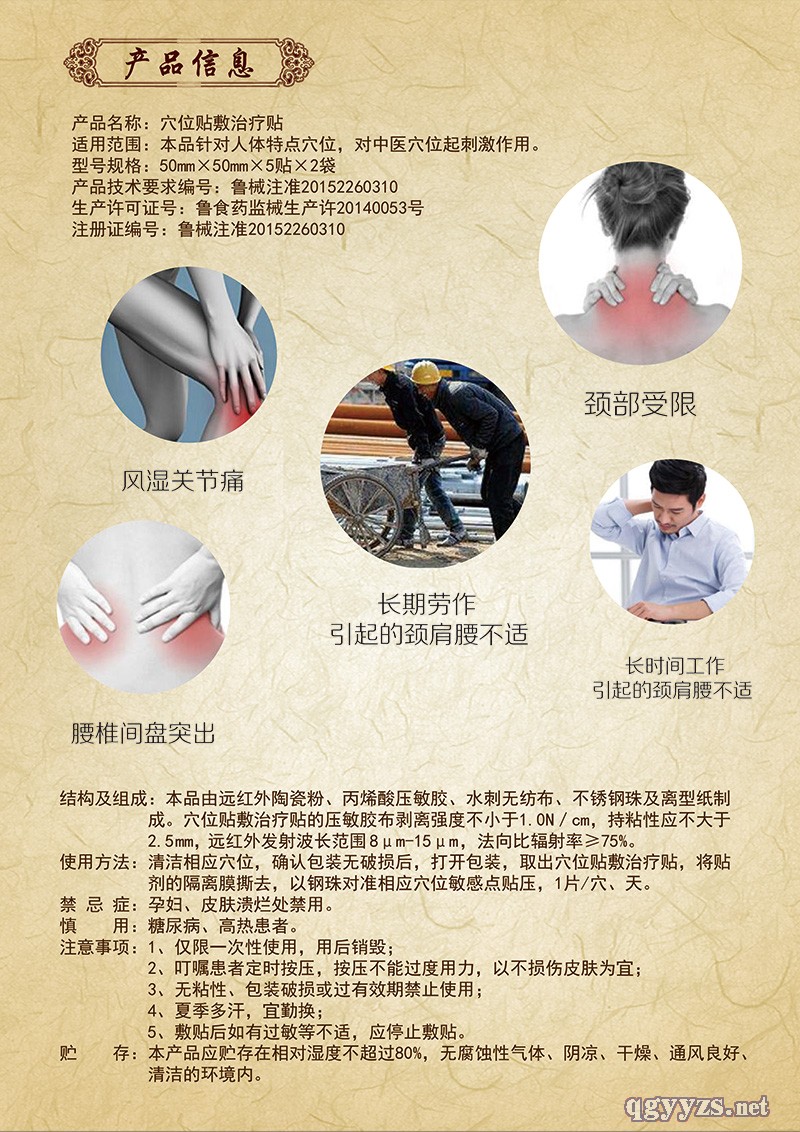 | 使用方法 | 清潔相應(yīng)穴位,確認(rèn)包裝無(wú)破損后,打開(kāi)包裝,取出穴位貼敷治療貼,將貼劑的隔離膜撕去,以鋼珠對(duì)準(zhǔn)相應(yīng)穴位敏感點(diǎn)按壓,1片/穴、天。 |