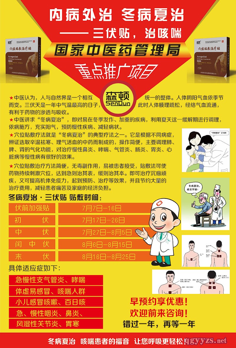 | 其它說(shuō)明 | 貼敷時(shí)間:一般成人8-10小時(shí),兒童4-6小時(shí)。根據(jù)個(gè)體差異,貼敷時(shí)間也可以做適當(dāng)調(diào)整。貼敷期間,慎食辛辣、海鮮、羊肉、蘑菇等食物。 正常反應(yīng): 1.貼敷后局部皮膚微紅或有色素沉著、輕度搔癢均為正常反應(yīng),不影響療效。 2.貼敷后皮膚局部出現(xiàn)刺癢難忍、灼熱、疼痛感覺(jué)時(shí),應(yīng)立即取下藥膏,禁止抓撓,不宜擅自涂抹藥物,一般可自行痊愈。 3.若皮膚出現(xiàn)紅腫、水泡等嚴(yán)重反應(yīng),需及時(shí)皮膚科就醫(yī)。 禁忌事項(xiàng):肺炎及多種感染性疾病急性發(fā)熱期;對(duì)貼敷藥物極度敏感,特殊體質(zhì)及接觸性皮炎等皮膚病患者;貼敷穴位局部皮膚有破潰者;妊娠期婦女;糖尿病患者;腫瘤患者等。 |