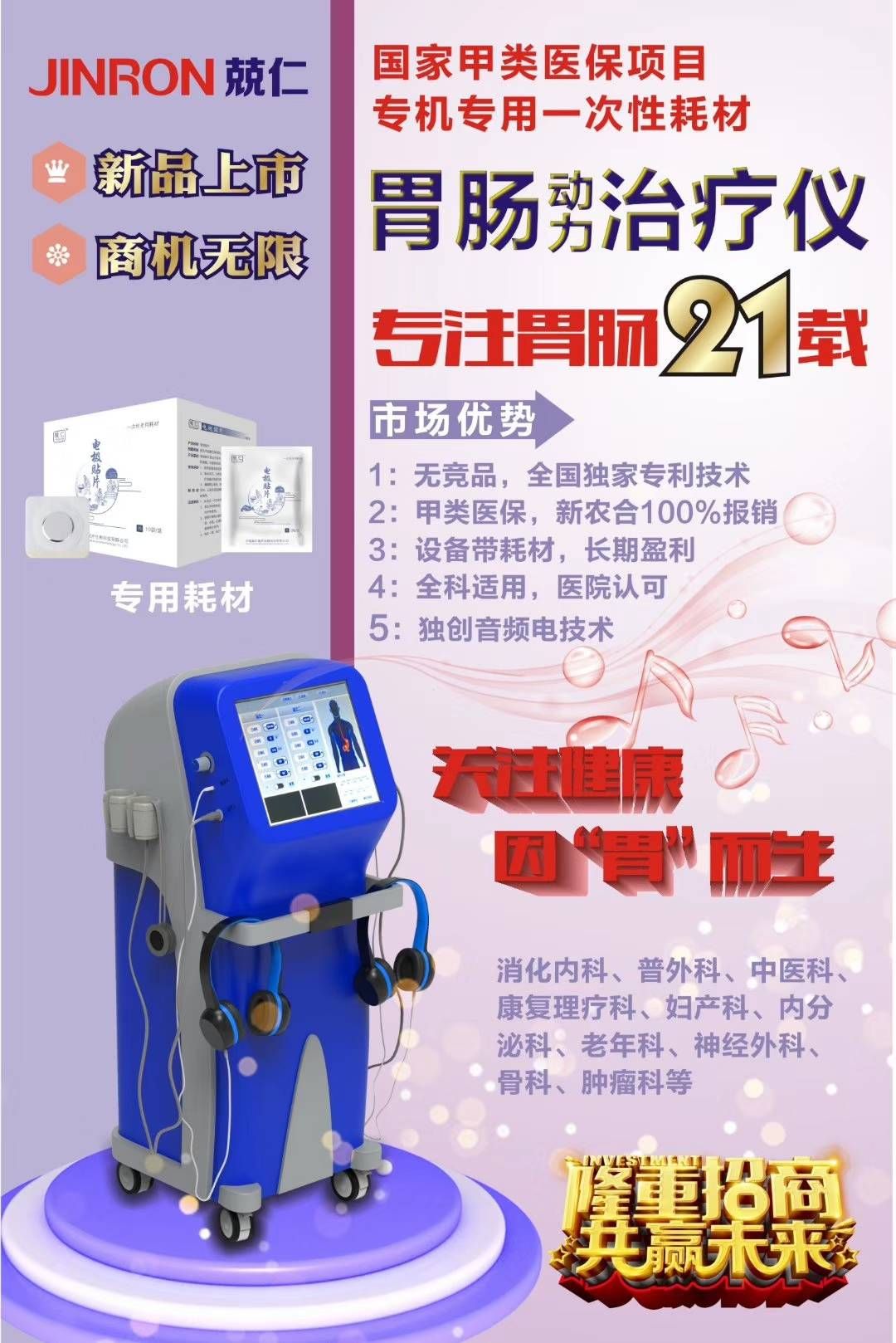 | 產(chǎn)品用途 | 適用科室:消化內(nèi)科、老年科、普外科、泌尿外科、肝膽外科、神經(jīng)外科、神經(jīng)內(nèi)科、骨科、中醫(yī)科、康復(fù)理療科、腫瘤科、婦產(chǎn)科、內(nèi)分泌科、重癥監(jiān)護(hù)室等。br適應(yīng)癥:習(xí)慣性便秘、**胃腸動(dòng)力障礙性疾病、術(shù)后排氣、術(shù)后便秘、術(shù)后胃輕癱、術(shù)后胃腸功能紊亂、化療后頑固性惡心、嘔吐、呃逆、胃電圖異常表現(xiàn)如胃動(dòng)過速胃動(dòng)過緩、胃電節(jié)律紊亂、腸粘連、結(jié)腸炎、闌尾炎、胃病等胃腸疾病、功能性腹脹、腹痛、腸易激綜合征、其他功能性胃腸疾病或術(shù)后綜合征。 |