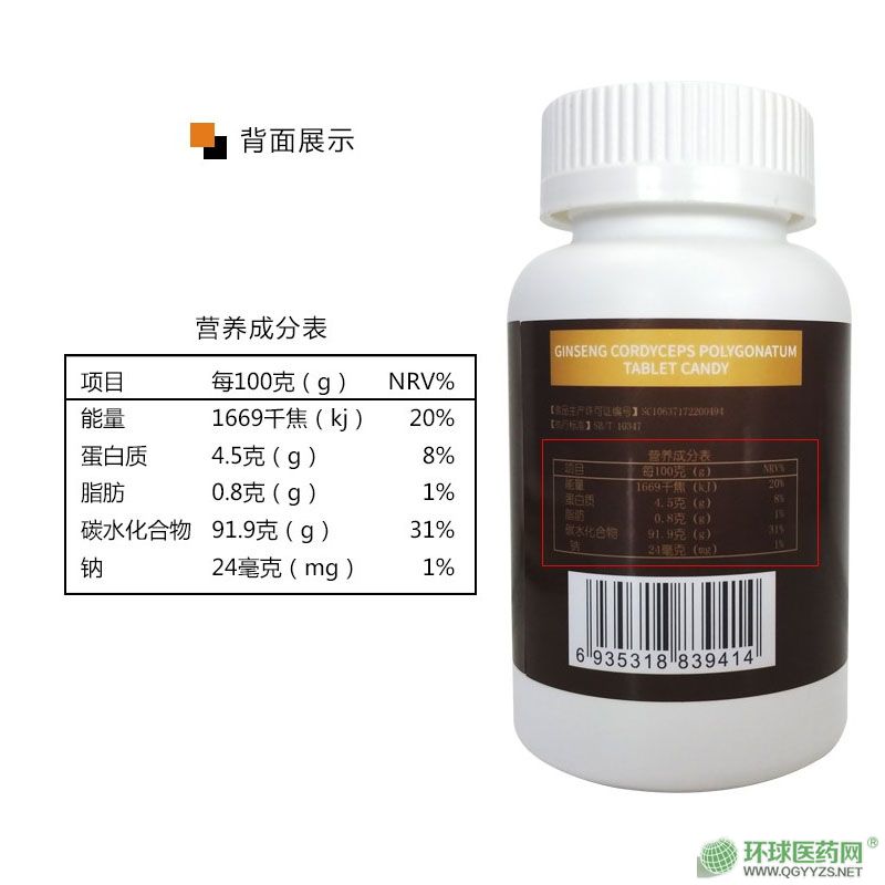 | 主要成分 | 乳糖、微晶纖維素、蛹蟲(chóng)草粉、人參粉、黃精提取物、山梨糖醇、硬脂酸鎂、三氯蔗糖 |