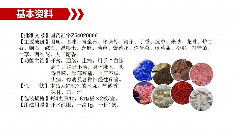 | 主要成分 | 珊瑚、珍珠、青金石、珍珠母、訶子、木香、紅花、丁香、沉香、朱砂、龍骨、爐甘石、腦石、磁石、禹糧土、芝麻、葫蘆、紫菀花、獐牙菜、藏菖蒲、榜那、打箭菊、甘草、西紅花、人工麝香。 |