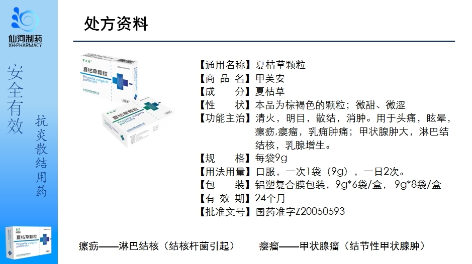 | 功能主治 | 清火,明目,散結(jié),消腫。用于頭痛,眩暈,瘰疬,癭瘤,乳癰腫痛,甲狀腺腫大,淋巴結(jié)結(jié)核,乳腺增生。 |
