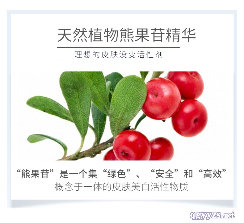 | 作用機理 | 核心美白成份熊果苷,萃取自熊果的葉子,能有效阻止黑色素生成,減少皮膚色素沉積,**又達到即時美白的效果。熊果苷是源于綠色植物的天然活性物質(zhì) |