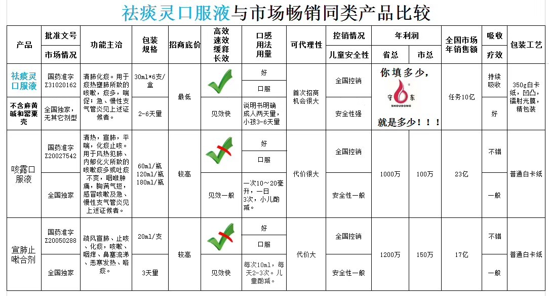 | 補(bǔ)充說明 | 1、全國**醫(yī)保 2、純中藥,不好麻黃堿,不含***,不含乙醇,無藥物依賴性,標(biāo)本兼治 3、口感清甜,服用方便,兒童愛喝(一盒3-6天用量) 4、清肺、化痰、止咳、平喘、消炎、氣管炎六效合一 5、地道藥材,經(jīng)典配方(鮮竹瀝含藥量達(dá)到70,而其他同類產(chǎn)品含藥量在42,而且祛痰靈的規(guī)格是180毫升,而其他規(guī)格多為60毫升) 6、含有天然又**的抗生素魚腥草,完美結(jié)合,療效** 7、無其他劑型,市場競爭小 8、上海產(chǎn)地、**產(chǎn)品 【財(cái)富熱線】18916311867 |
