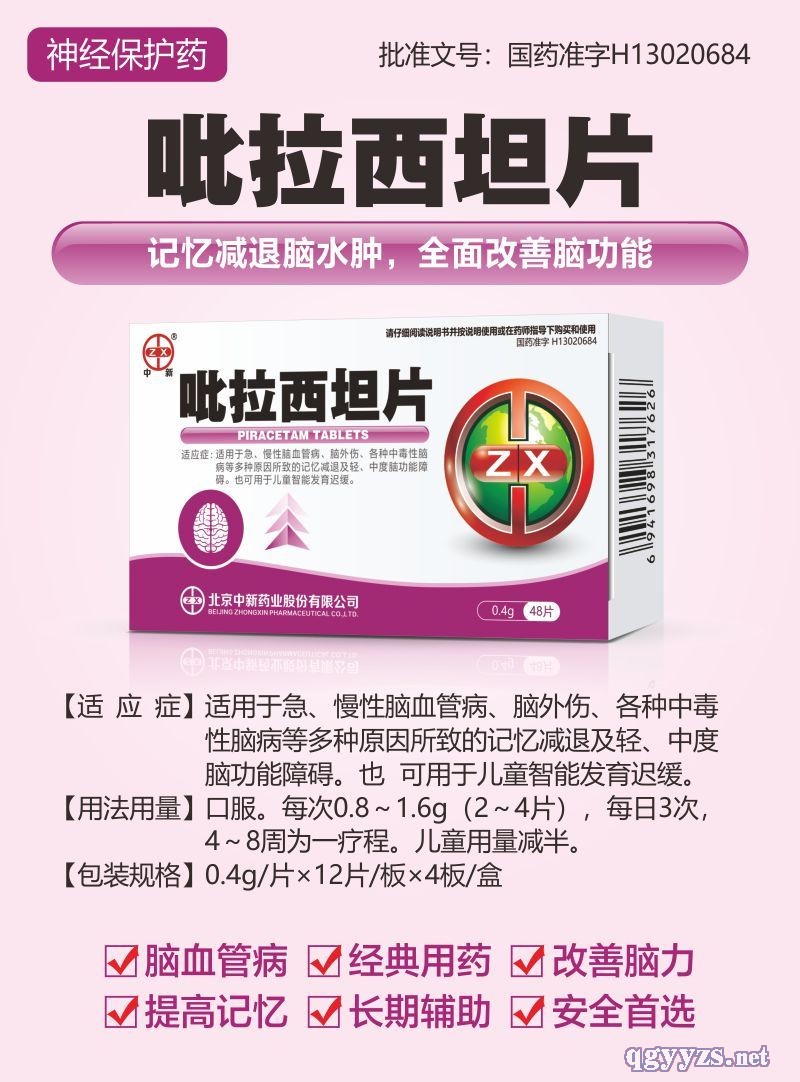 | 適應癥 | 適用于急、慢性腦血管病、腦外傷、**中毒性腦病等多種原因所致的記憶減退及輕、中度腦功能障礙。也可用于兒童智能發(fā)育遲緩。 |